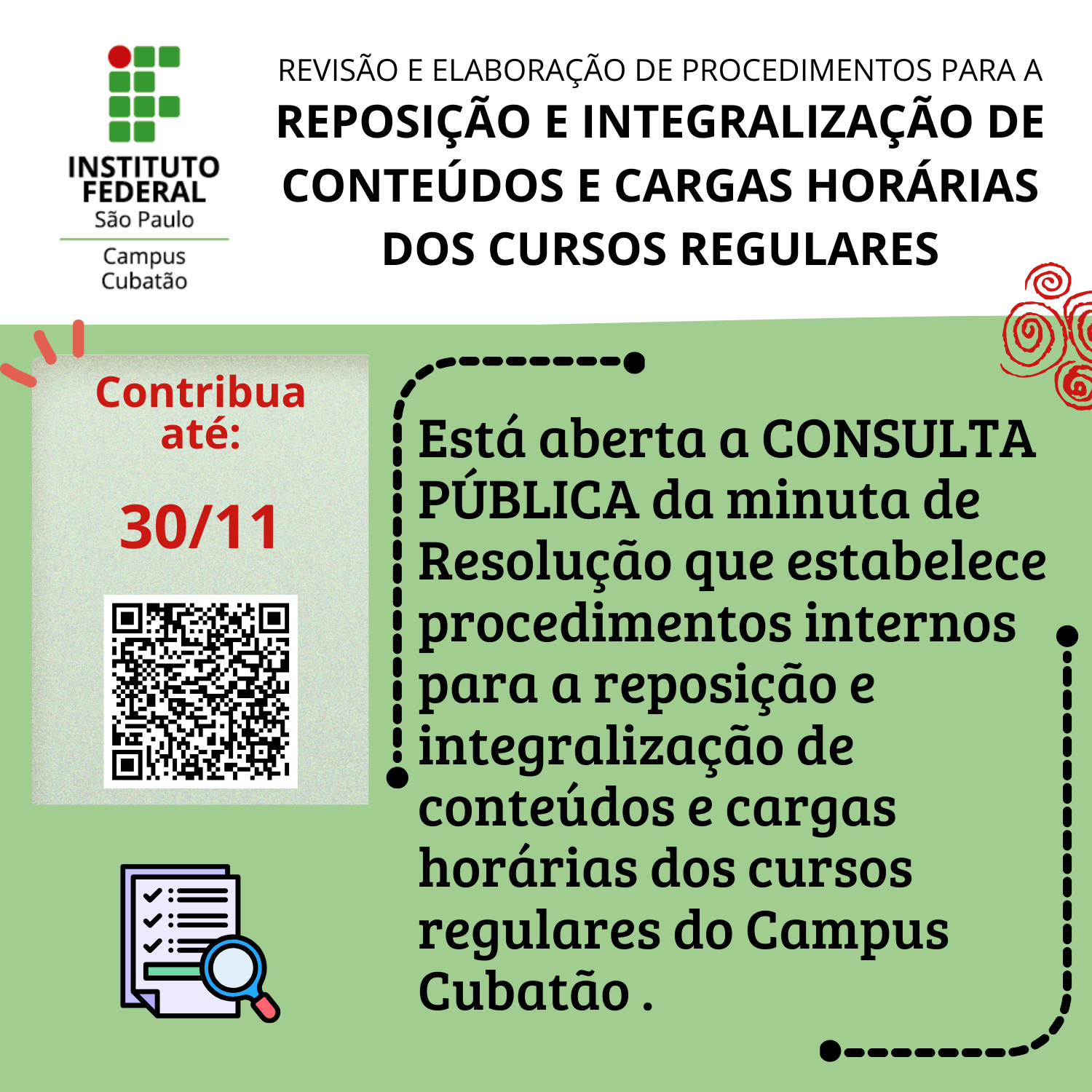 O Campus Cubatão do IFSP convida estudantes e servidores a participarem da consulta pública referente à Minuta do Regulamento de procedimentos internos para reposição de aulas e...