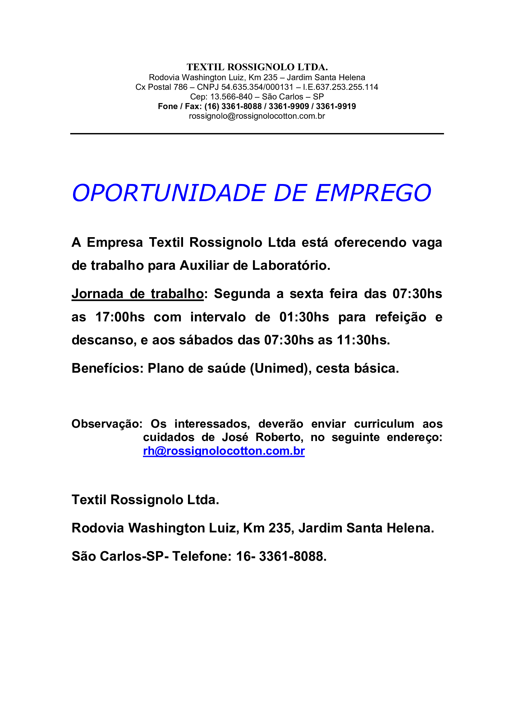 Têxtil Rossignolo - Auxiliar de Laboratório