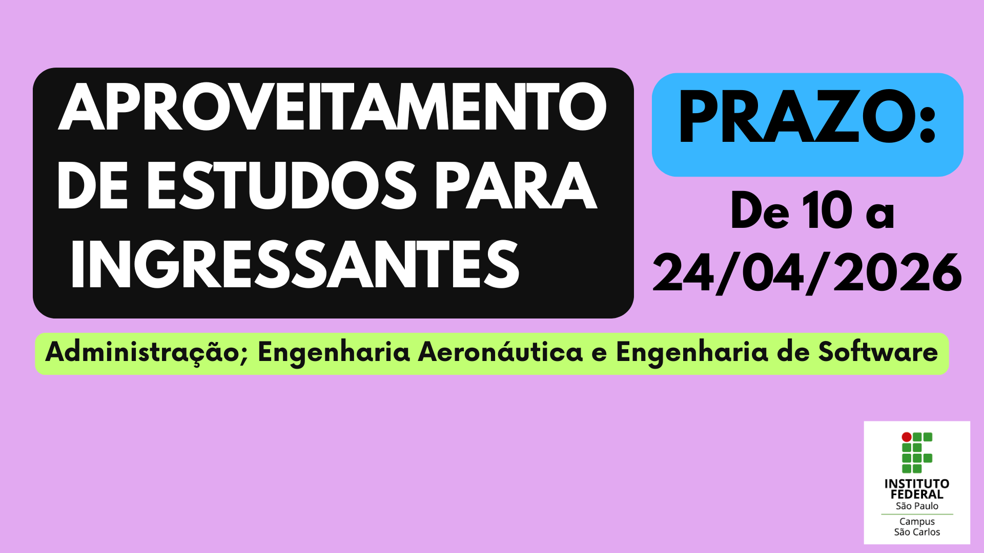 A Coordenadoria de Registros Acadêmicos (CRA) informa que será aberto um novo prazo para que os alunos INGRESSANTES de 2026/1 dos cursos de Bacharelado em Software, Administração e Engenharia Aeronáutica possam requerer o Aproveitamento de Estudos. O novo período para solicitação será de 10 a 24/04/2026. Os requerimentos devem ser feitos pelo SUAP, com toda a documentação...