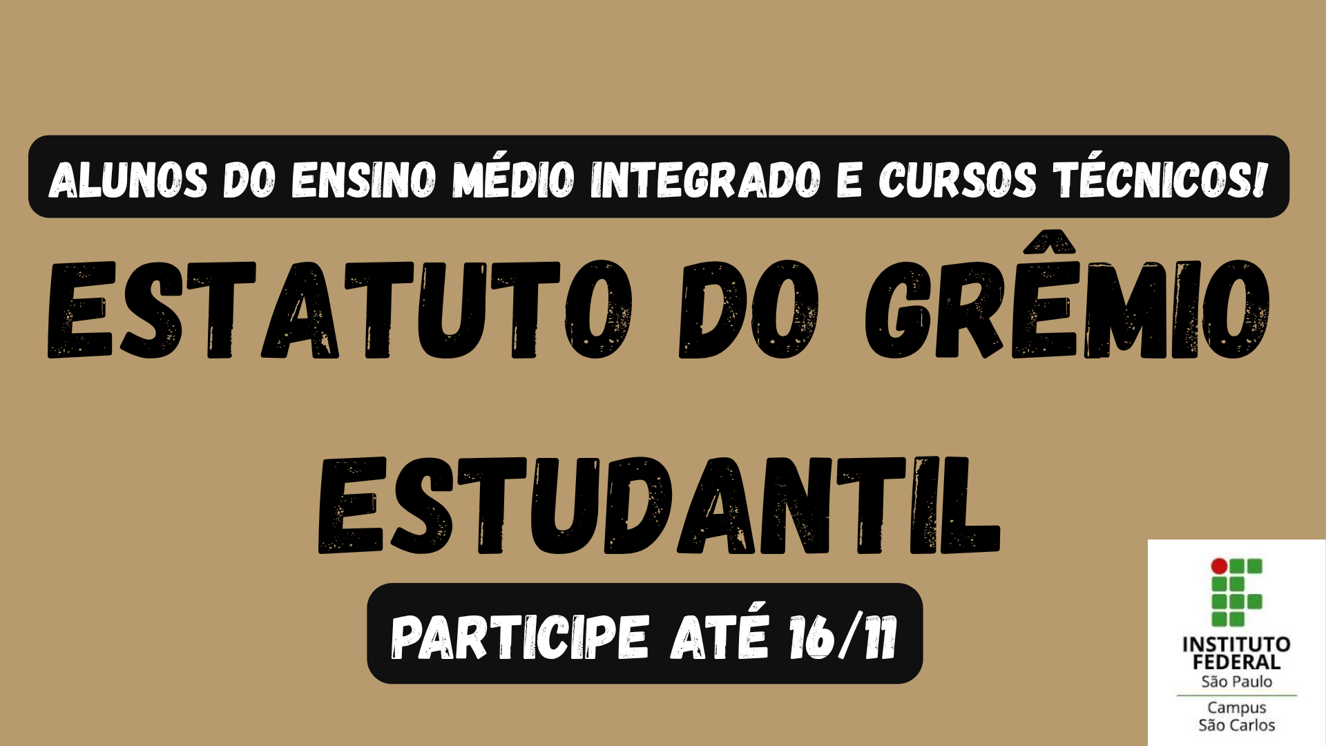 A Equipe Gestora do Grêmio Estudantil do Campus São Carlos, disponibiliza a prévia de seu Estatuto e convida dos alunos do Ensino Médio Integrado e Cursos Técnicos para fazer...