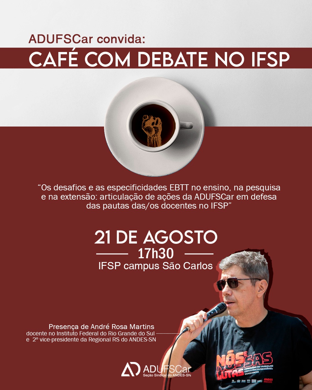 A partir do compromisso com a atuação sindical participativa e em diálogo com a categoria, a ADUFSCar convida as/os docentes do IFSP campus São Carlos para o "Café com Debate", atividade que discutirá os desafios e as especificidades EBTT no ensino, na pesquisa e na extensão.