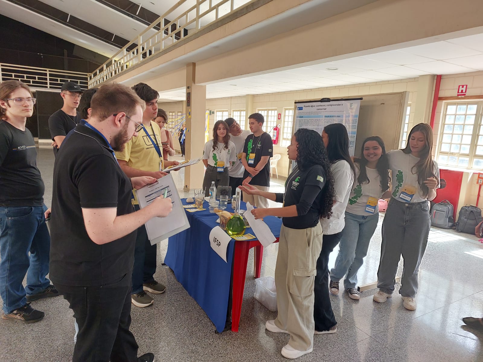 Os alunos apresentaram o projeto “Planeta Água: conhecer, compreender e conservar”, coordenado pela professora de Biologia Renata Paro e pelo professor de Química Matheus Sato. O trabalho teve como destaque o experimento da descalcificação do ovo cru de galinha, que despertou grande interesse do público por permitir compreender, de forma simples e visual, o processo de descalcificação e sua correlação com o branqueamento e a morte dos corais, fenômenos diretamente ligados às mudanças climáticas e ao aquecimento global.