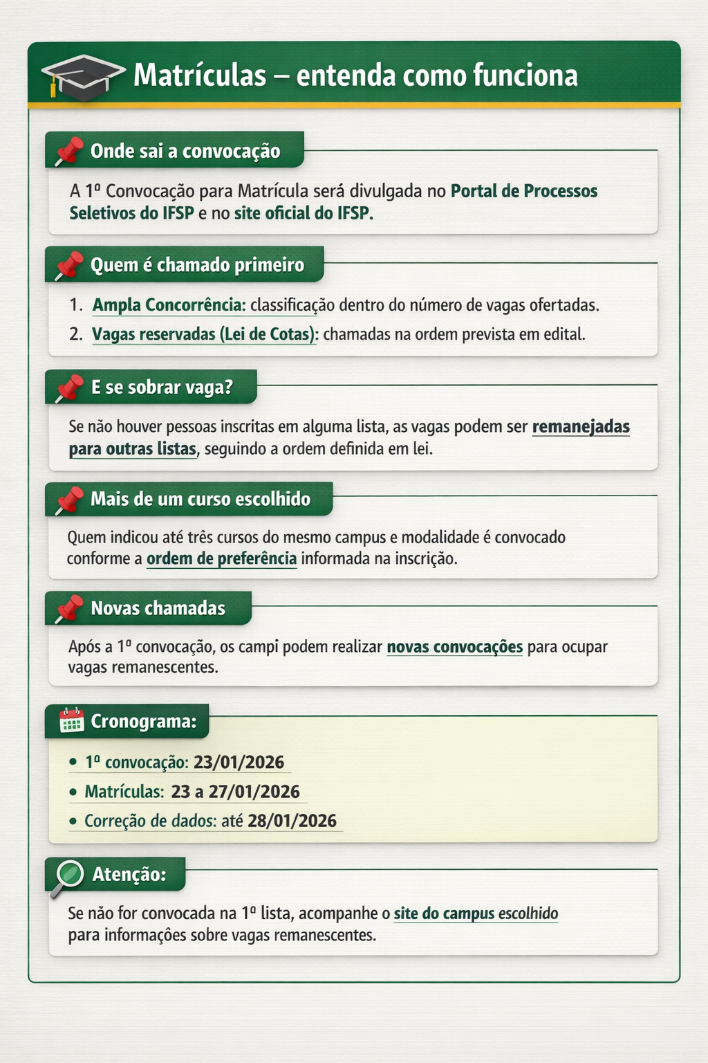 A 1ª Convocação para Matrícula será publicada no dia sexta-feira, 23 de janeiro de 2026, no Portal de Processos Seletivos do IFSP e na página institucional. As matrículas referentes a essa chamada deverão ser realizadas entre 23 e 27 de janeiro de 2026, de acordo com as orientações específicas de cada campus.